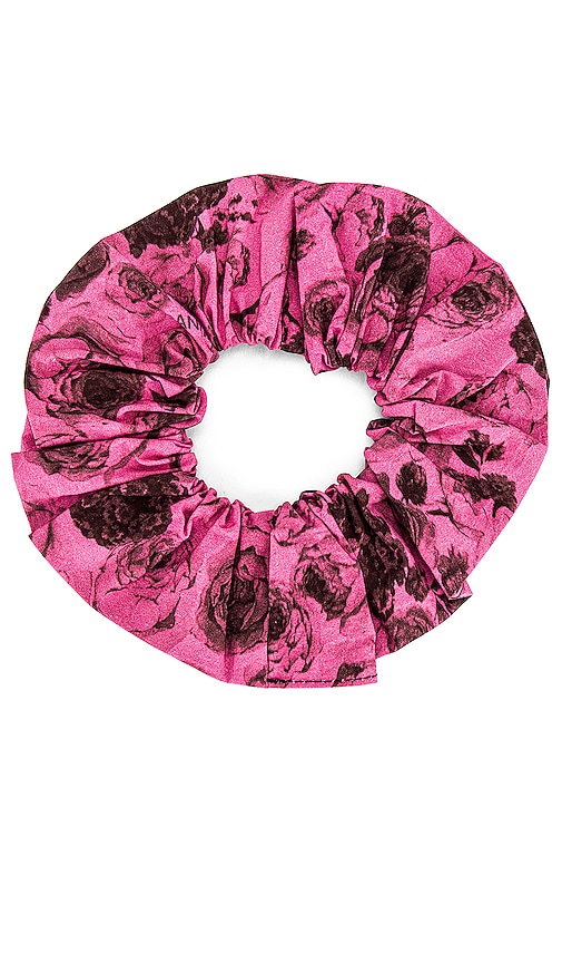 Ganni Scrunchie in Pink. 100% organic cotton. Made in India. Oversized. Seasonal GANNI print. Slightly stiff poplin fabric. Measures approx 6 in diameter. GANR-WA27. A3399. Founded in 2000, the Ganni brand aims to design effortless staples for a woman's wardrobe that she's tempted to reach for day in and day out. By doing this, they create quality fashion that can be worn in many different ways to suit any personal style.