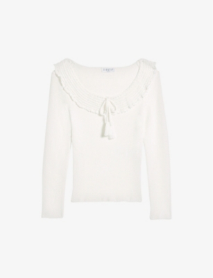 While our knitwear is prominently reserved for the winter chill, Claudie Pierlot’s second skin Mousse top has other ideas. Spun to a fine knit, the long sleeved style is just as suited for layering under your chunky cardi on a cloudy day as it is to riding solo when the sun comes out to play. What’s more, the transseasonal piece stays loyal to its French roots thanks to the addition of its crochet collar. As for styling? Tuck yours into an A line mini skirt as you roam the streets of Paree.Claudie Pierlot stretch knit top62% viscose, 26% nylon, 10% linen, 2% elastane; collar 75% viscose, 13% linen, 12% nylonSlips onSelf tie round neck, crochet trimmed collar, long sleeves, regular fit, ribbed texture, fine knit, straight hemHand washTrue to sizeModel is 5ft 9in/1.75m and wears a size UK 8Midweight, stretchy