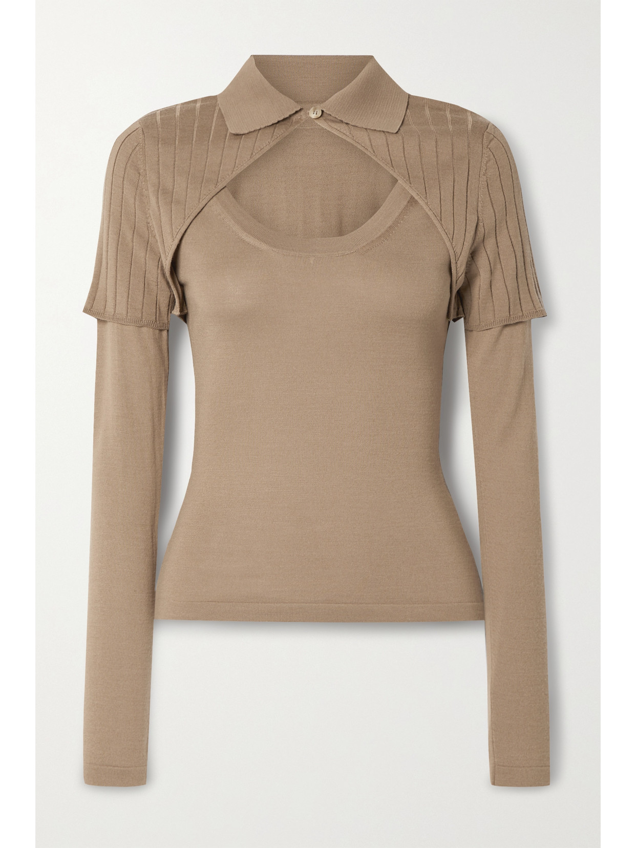 Jacquemus' unconventional sweater is designed with a ribbed layer that resembles a cropped cardigan. It's made from a merino wool-blend and has a polo collar and cutout neckline that frames your décolletage. Tuck yours into a tonal skirt or wear it with jeans. Wear it with: [Jacquemus Skirt id1264443], [Jacquemus Tote id1267045], [Bottega Veneta Sandals id1255831].