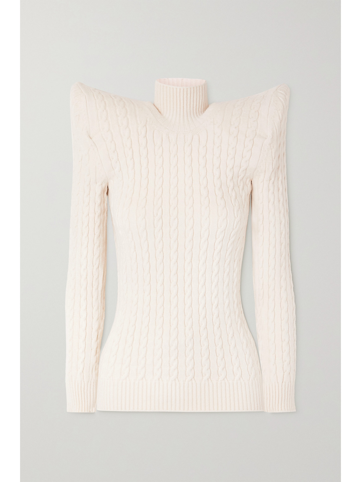 Balenciaga's turtleneck sweater debuted on the label's Fall '20 runway, where it stood out for its dramatic, angular padded shoulders. It's been made in Italy from tactile velvet with cable knit-effect detailing and has a slim fit through the bodice. Wear yours with a pencil skirt and knee boots to channel the show styling. Wear it with: [Balenciaga Skirt id1281876], [Balenciaga Shoulder bag id1249740], [Balenciaga Ankle boots id1306395], [Balenciaga Earrings id1238527].
