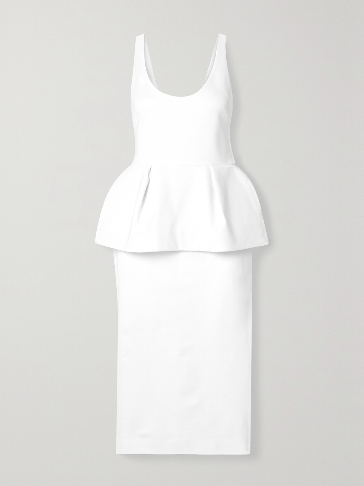 Cushnie's midi dress is minimally designed with a pleated peplum overlay, which creates the illusion of a flattering hourglass shape. It's made from white stretch-crepe in a slim silhouette with a scooped neckline and has a split at the back hem to ensure ease of movement. Wear it to a cocktail party with strappy sandals and statement jewelry. Wear it with: [Nancy Gonzalez Clutch id1269229], [The Attico Sandals id1262136].