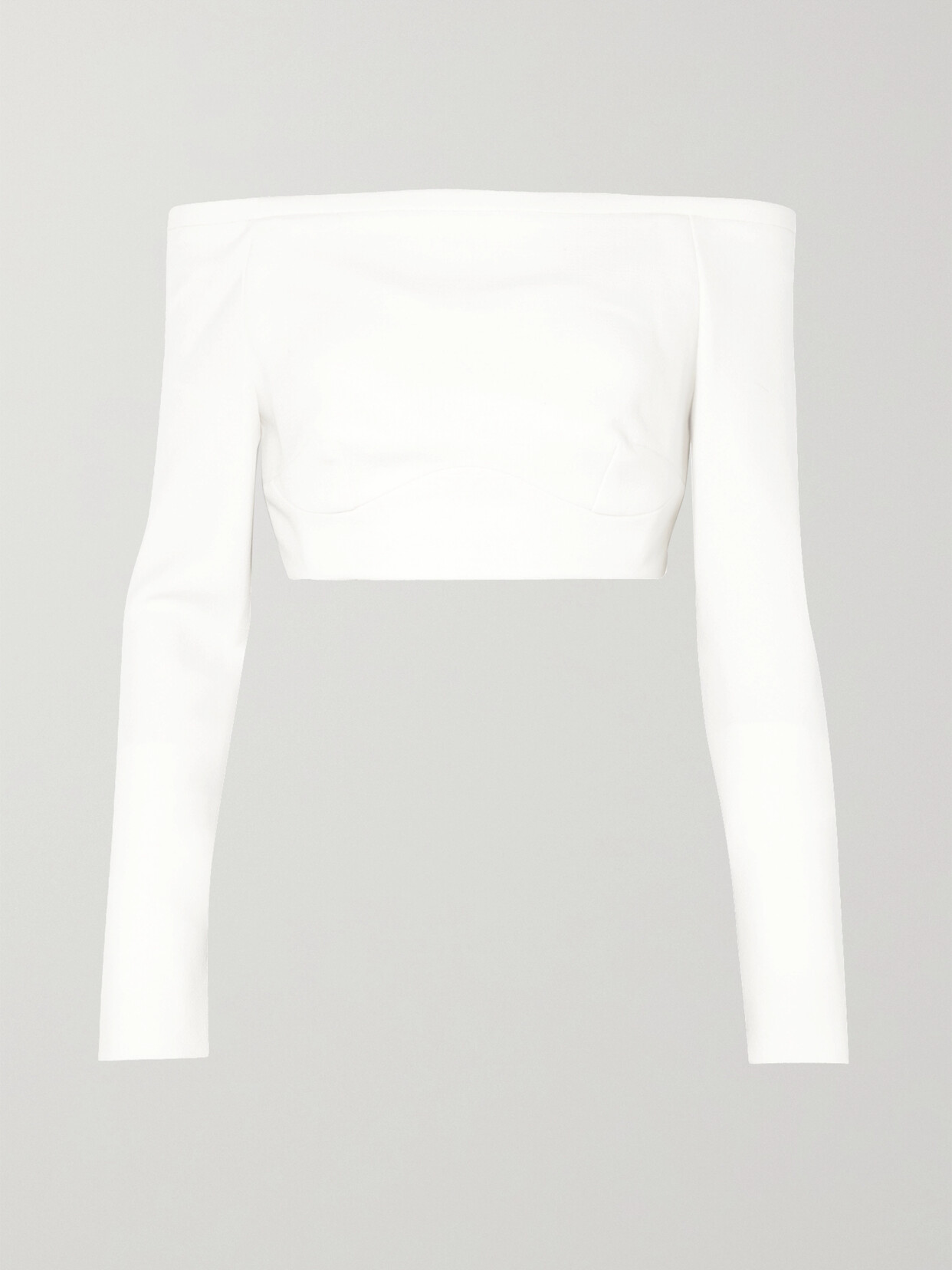 EXCLUSIVE AT NET-A-PORTER.COM. Emilia Wickstead chooses fabrics for her bridal collections so carefully - each one is primarily comfortable and will look great throughout the entire celebrations. Only available here, this off-the-shoulder 'Gerda' top is made from sculpting ivory wool-crepe and lined for a smooth silhouette. Wear yours with the coordinating [pants id1088557] and a closed-toe pump, just as the designer suggests.