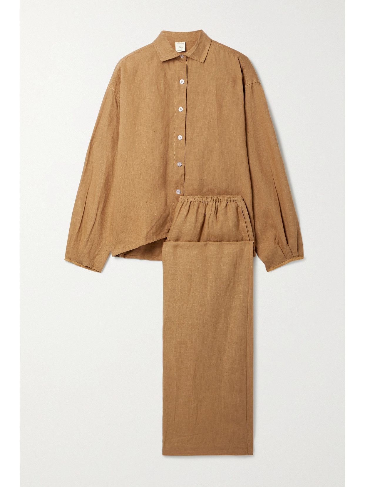 Deiji Studios' set is made from EUROPEAN FLAX® French linen - it's grown without harmful dyes or GMOs, and the entire plant is used resulting in zero waste. Stone-washed for softness, it includes a button-down shirt and elasticated pants, both in a versatile 'Walnut' hue. Wear yours while lounging at home or style them separately, depending on your plans. This product was created using Considered Materials. Find out more about NET SUSTAIN here.