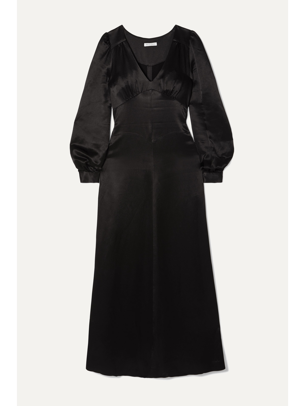 EXCLUSIVE AT NET-A-PORTER. The best part about Bella Freud's 'Nova' dress is that it will lend itself to so many occasions - a change of shoes will instantly transform your look. Cut from lustrous hammered-satin, it has lightly puffed sleeves, a contoured waist and plunging neckline that's perfect for framing a dainty necklace. Balance the length with heels. Shown here with: [Jimmy Choo Clutch id1197059], [Sergio Rossi Sandals id1203771], [Isabel Marant Earrings id1133461].