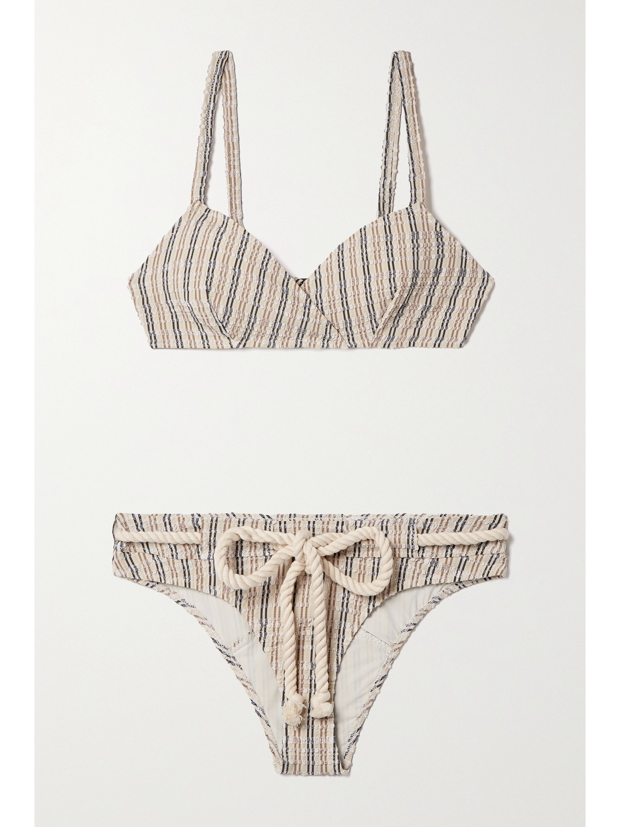 Lisa Marie Fernandez admits to having an obsession with fabric, which is why her collections always include unique textures and colors. This striped seersucker 'Yasmin' bikini has a wrap-effect top and low-rise briefs topped with a nautical rope belt. Wear yours on vacation with one of the label's airy coverups. This product was Locally Made. Find out more about NET SUSTAIN here.
