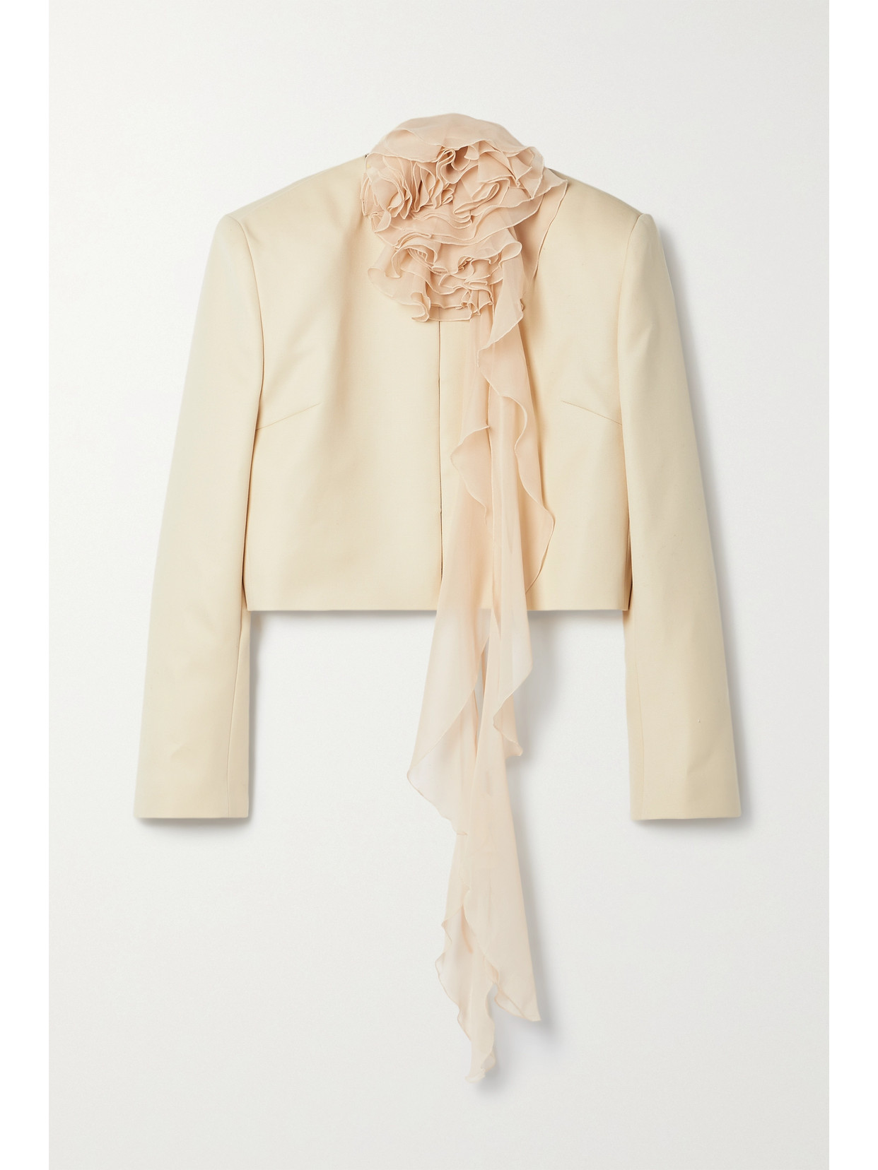 Magda Butrym's blazer is topped with a silk-organza flower that you can knot around your neck - it detaches if you prefer a more minimal look, too. Made from beige wool-twill, it has a cropped silhouette and angular shoulders that complement its boxy shape. Wear yours with jeans and tonal tailoring alike.