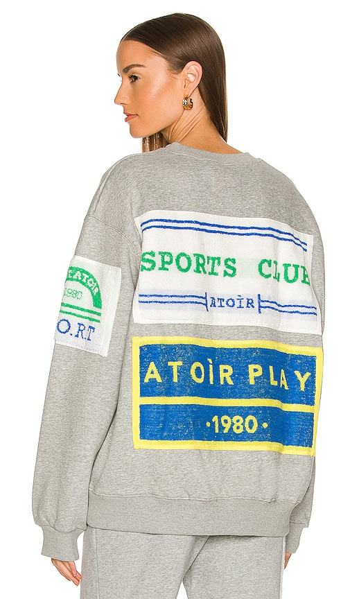 Atoir SPORTSCLUB The Sport Club Jumper in Grey. Size M, S, XS. SPORTS CLUB - ATOIR PLAY - 1980RIOT ATOIR 1980 S.P.O.R.T. 55% cotton 45% poly. Made in China. Hand wash. Terrycloth patches with screen print lettering at sleeve and back. Fleece fabric with banded hem. Oversized fit. Item not sold as a set. ATOR-WK30. AT200372. ATOIR is a journey of refinement and growth, an exploration of elevated outfitting composed by the revered design prose of Cynthia Farchione. Never ordinary, ATOIR effortlessly blends architectural lines, confident simplicity and directional styling to form a cohesive collection of modern versatility. ATOIR's signature style is expressed not only through apparel but in every aspect of the label, from campaign imagery and styling to the showroom experience. Each collection pursues a design narrative of vast interconnectedness with purposeful intent. ATOIR manifests a 'coup de foudre' enigma for visionary, unforgettable designs.