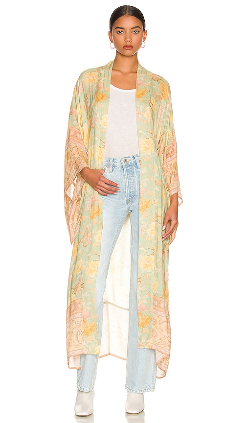 SPELL Butterfly Maxi Robe in Lemon. Size S/M. 100% viscose. Made in China. Hand wash. Open front with removable waist tie. Front slip pockets. Kimono sleeves. Lightweight jersey fabric with asymmetrical hem. SPEL-WO50. 214141B51. Enamored by the feeling of creating chic bohemian selections, sisters Elizabeth and Isabella sought out to create timeless vintage designs through global fashion house SPELL. With unforgettable pieces that never go out of style, SPELL taps into a sense of nostalgia through flowing feminine dresses, florals and age-old lace channeling one?s inner festival spirit with a focus on transitioning towards more sustainable earth friendly fibers.