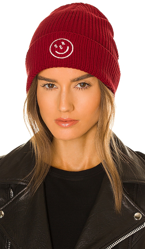 SER.O.YA Rocco Beanie in Burgundy. 100% cotton. Made in China. Machine wash. Foldover hem with embroidered smiley detail. Ribbed knit fabric. SERR-WA7. SR03-4613. SER.O.YA is a New York-based contemporary brand with a purpose that transcends fashion. Through a collection of unconstrained, gender-optional designs, SER.O.YA aims to be a vessel for positivity: spreading good energy, encouraging connectivity, and catalyzing social movement. Each drop, SER.O.YA partners with a different organization, with a portion of the proceeds being donated to each charitable cause. We say do you, wear you.