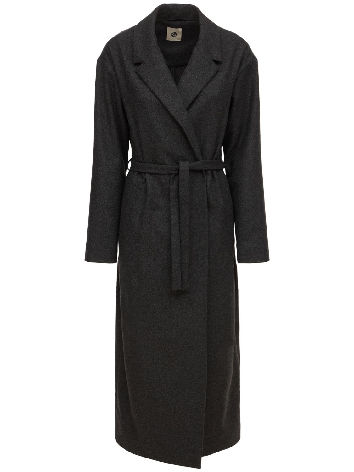 Front button closure. Includes matching self-tie belt. Center back vent. Two side pockets. Model is wearing a size8