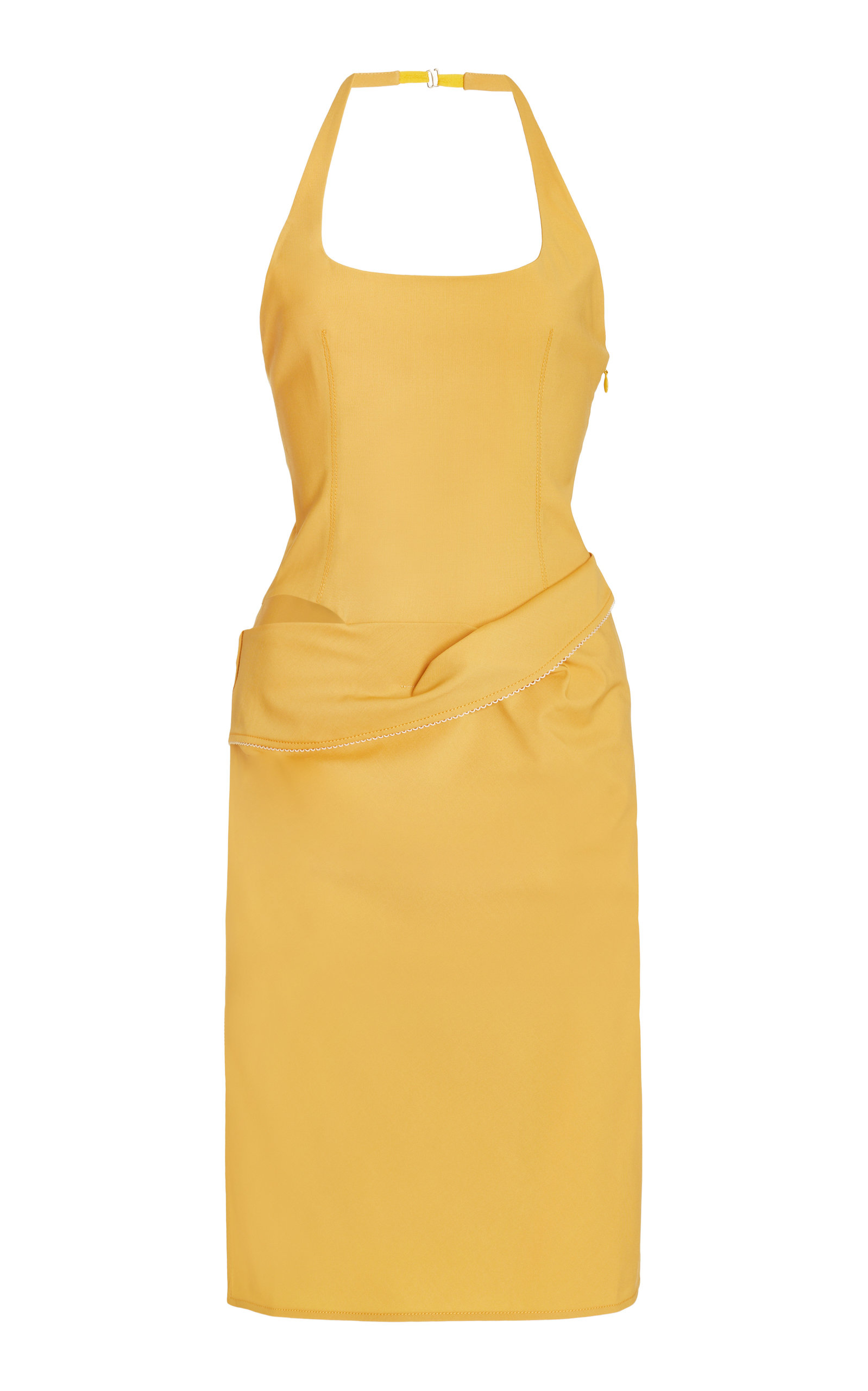 A Moda favorite and one of the most exciting designers working today; Simon Porte Jacquemus is one to watch. With influences that range from the art world to his own childhood by the seaside; the French creative builds an ultra-covetable collection each season that's fresh; never boring and always sexy.Made from a technical stretch-wool jersey; the 'Hielo' dress features a fitted halter-neck bodice that gives the illusion of a bodysuit peaking out from a draped slip skirt. Wear it solo or over the matching trousers to mirror the brand styling.