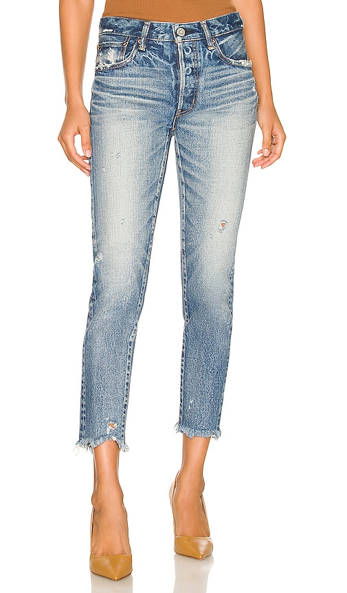 Moussy Vintage Merry Tapered in Blue. Size 26, 23, 24, 25, 27, 28, 29, 30, 31. Cotton blend with cowhide leather label. Made in Japan. Machine wash. Button fly. 5-pocket styling. Light whiskering and intentionally destroyed areas. Frayed raw cut hem. 14 at the knee narrows to 10.5 at the leg opening. MOUR-WJ140. 540FSC11-2040. Moussy is a denim brand that is high-end casual inspired by both luxury and leading trends. With sights set on being the world?s leading denim brand, Moussy pursues this ambition with confidence of made in Japan quality, passion, and focus.