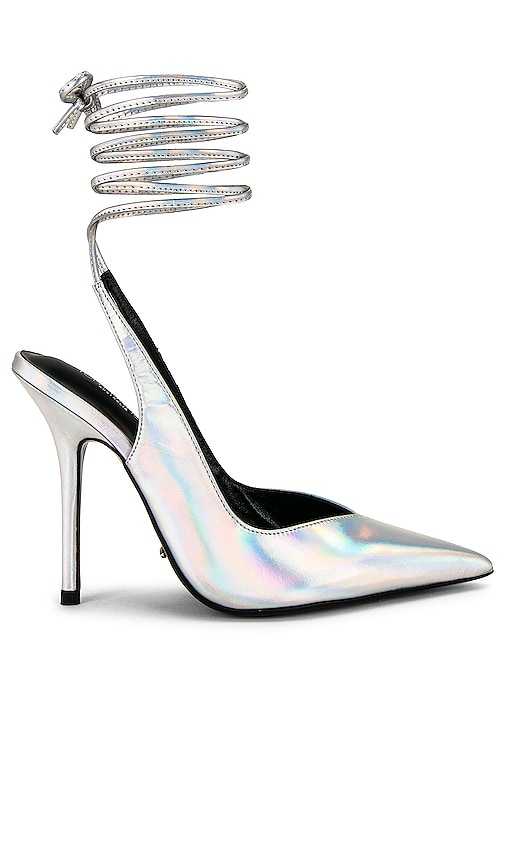 Tony Bianco Glint Heel in Metallic Silver. Size 6, 5.5, 6.5, 7, 7.5, 8, 8.5, 9.5, 10. Iridescent metallic leather upper with manmade sole. Imported. Wrapped ankle strap with tie closure. Leather lining. Pointed toe with stiletto heel. Approx 108mm/ 4.25 inch heel. TONR-WZ463. GLINT. Based out of Australia, the Tony Bianco brand embraces a mix of the contemporary, the classic, and the cool. Their signature can be seen in the use of high quality materials and a keen eye for detail that is used to create on-trend pieces that will survive the test of time.