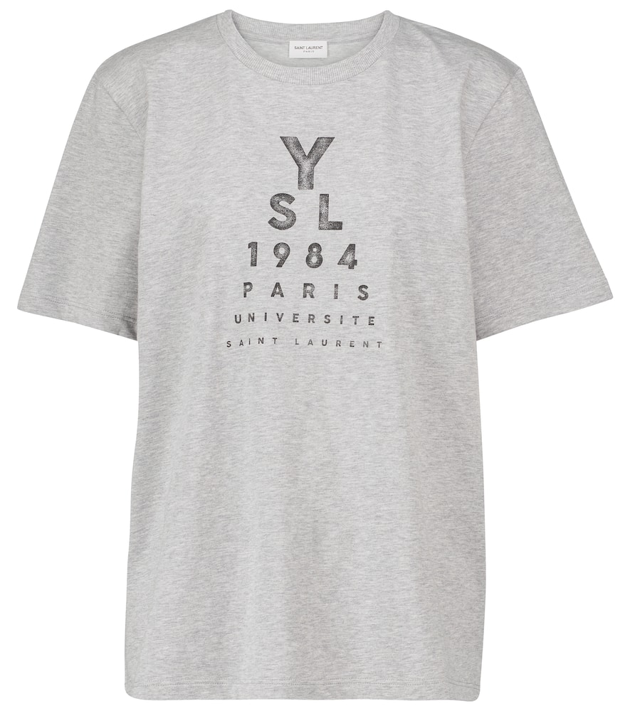 This gray T-shirt from Saint Laurent has a Snellen test-style logo print on the chest. Saint Laurent Printed cotton-jersey T-shirt